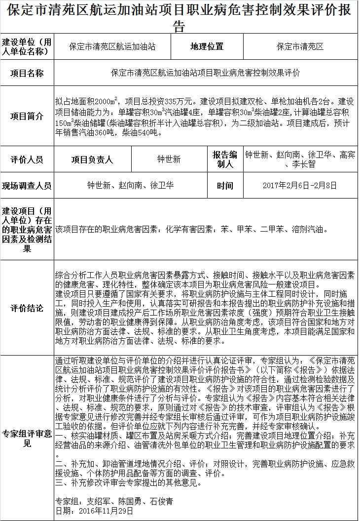 保定市清苑区航运加油站职业病危害控制效果评价